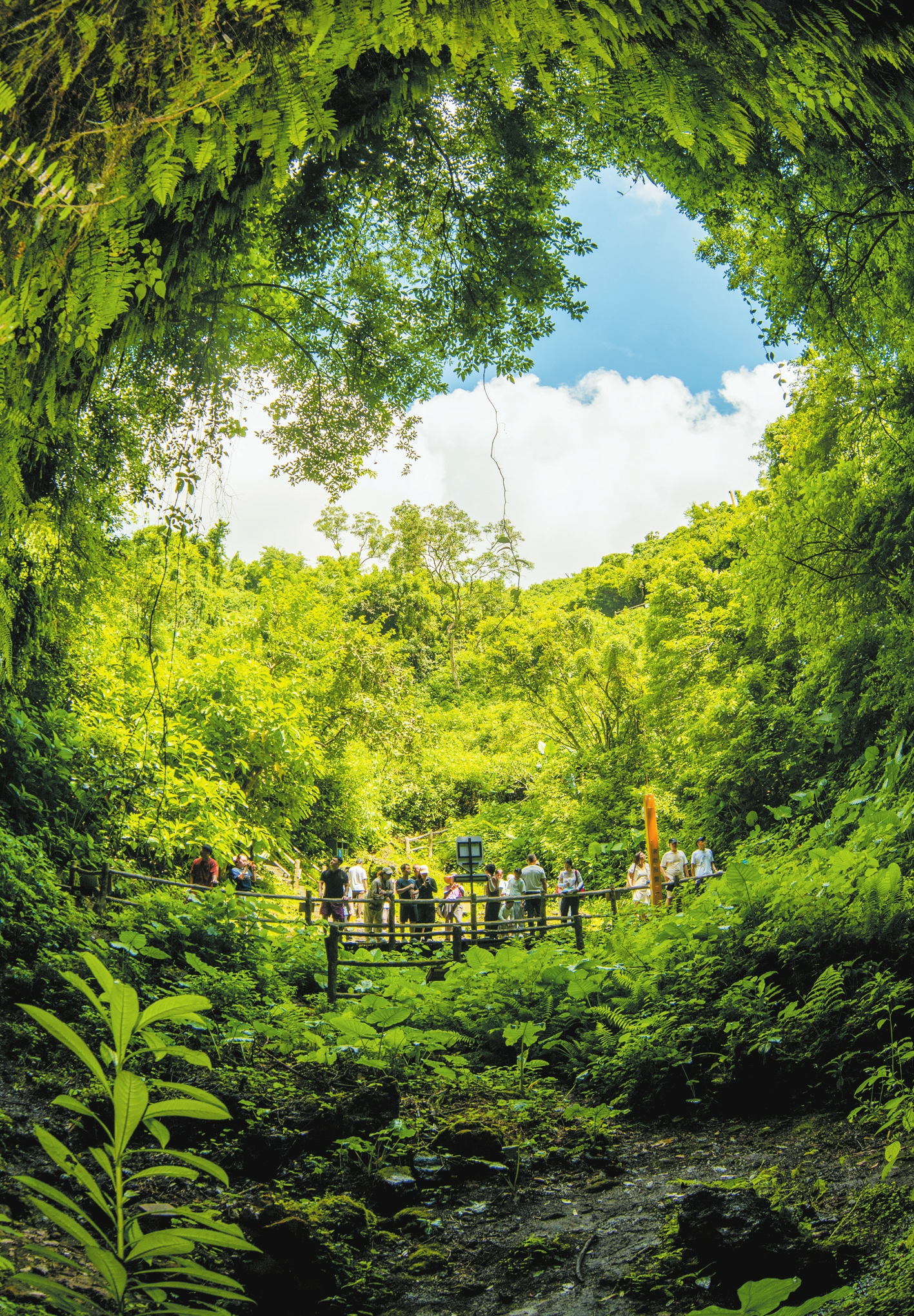 在海口火山口国家地质公园风炉岭塌陷洞口,不少亲子家庭正在观光游玩。本报记者 石中华 摄
