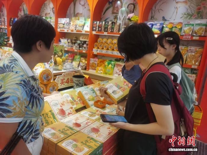 8月18日,游客在海口骑楼老街“椰喜鹿老爸茶礼”伴手礼店采购文创产品。 中新网记者 张茜翼 摄