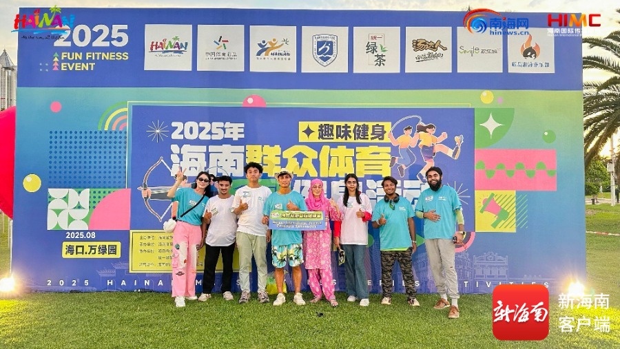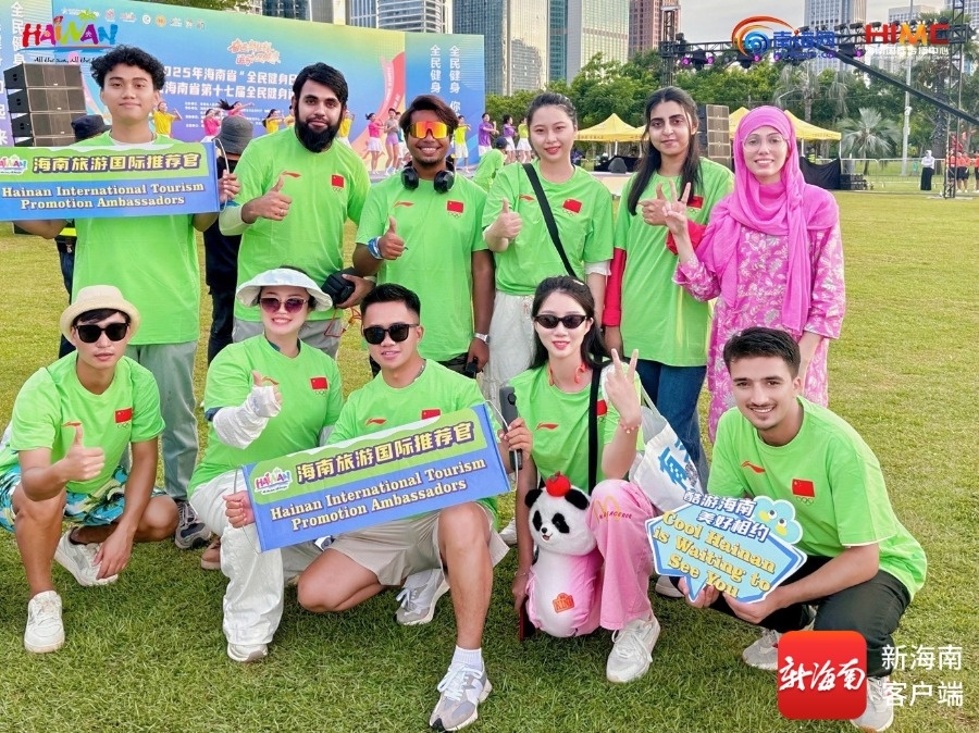海南旅游国际推荐官和外国留学生们打卡全民健身日活动。主办方供图