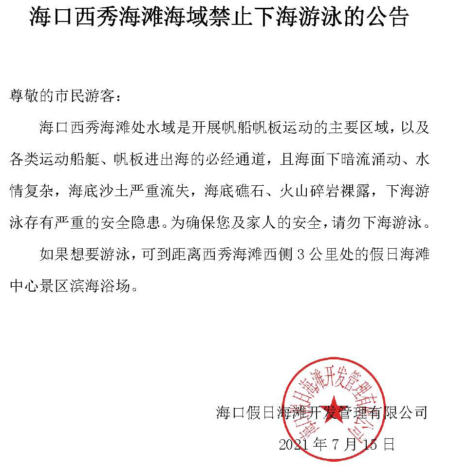 海口西秀海滩海域禁止下海游泳的公告