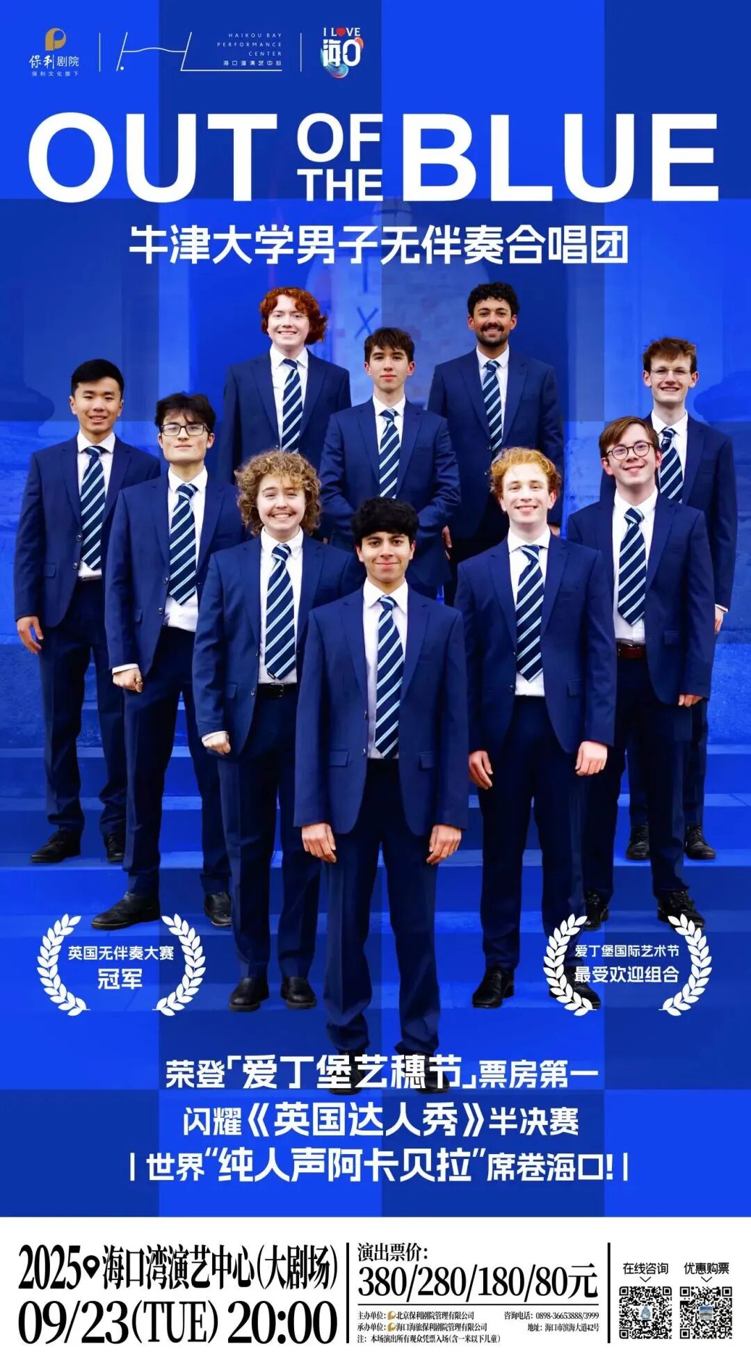 牛津大学男子无伴奏合唱团“Out of the Blue”是一支极具影响力的学霸合唱团,以卓越的音乐才华和独特的表演风格闻名于世,获得诸多荣誉。本次演出涵盖多首中外经典曲目,从邓丽君到阿黛尔,从爵士乐的即兴感、摇滚乐的张力到电影配乐的叙事性,通过阿卡贝拉的人声编排,展现无乐器状态下的音乐本质魅力,让观众专注于人声本身的纯净与灵动,感受 “人声乐器” 带来的独特听觉震撼。