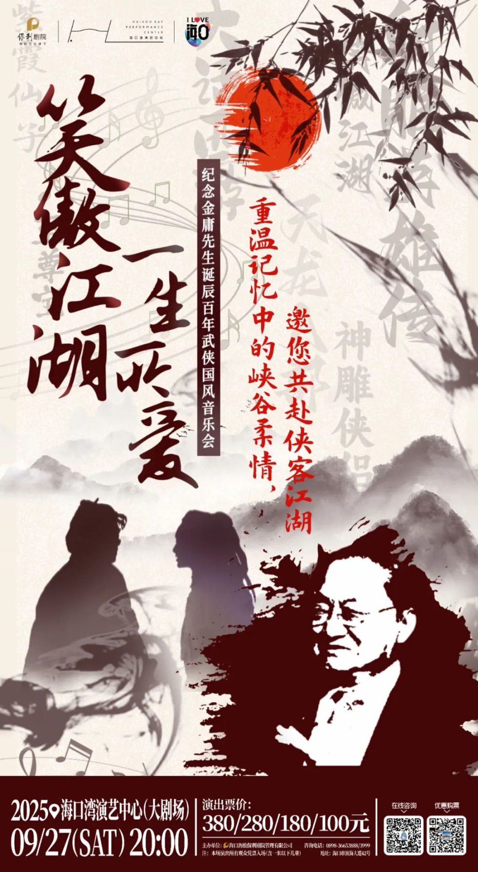 金庸先生与他的武侠世界,承载着一代人的集体记忆,也寄托着无数人心中的侠义情怀。为致敬这位武侠文学巨匠,音乐会将通过演奏金庸经典武侠作品的音乐以及融合现代国风元素的新创武侠乐章,带领大家重温那个刀光剑影的江湖世界,感受侠骨柔情的精神魅力。