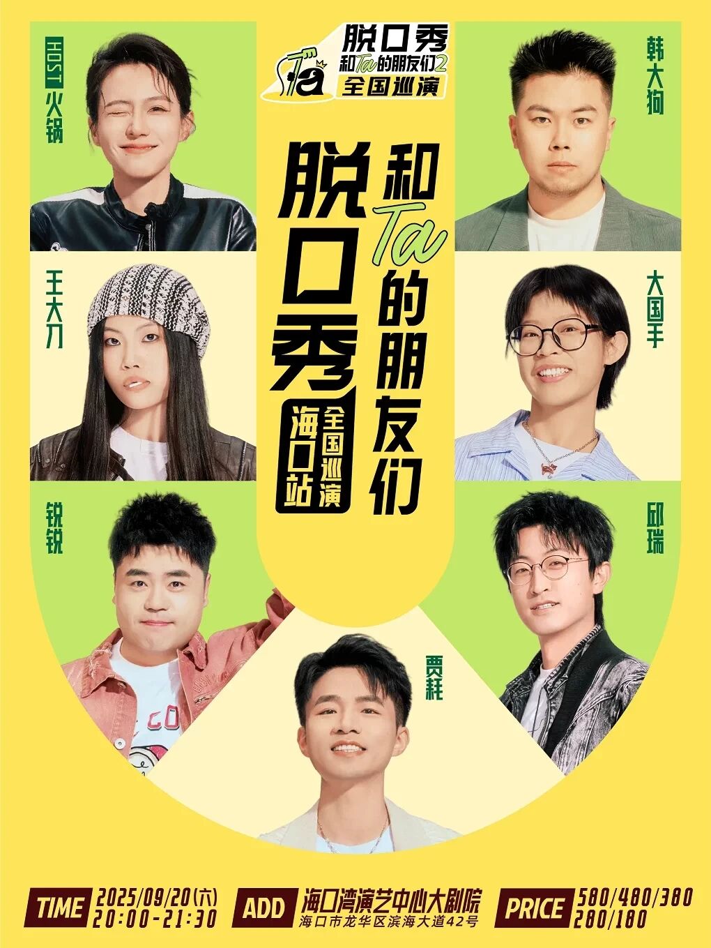 明星嘉宾集结,实力笑匠齐聚。本次演出邀请host火锅、王大刀、锐锐、贾耗、韩大狗、大国手、邱瑞等多位人气脱口秀演员登台。host火锅控场能力出众,邱瑞擅长用犀利视角解构生活,贾耗自带幽默节奏……他们风格各异,将携独家段子轮番上阵,为海口观众带来满场欢乐。