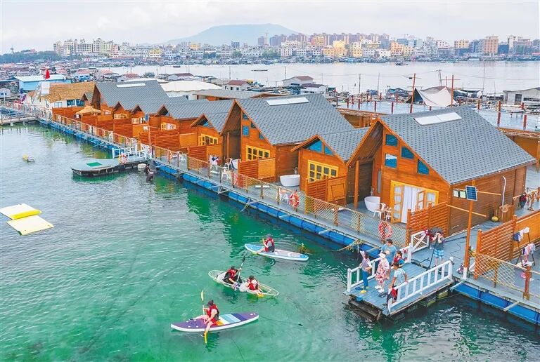 位于陵水新村港的疍家渔排,吸引众多游客前来居住游玩,体验多样的水上运动。海南日报全媒体记者 王程龙 摄