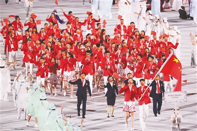 开幕式上,中国代表团在第110个出场,女排运动员朱婷和跆拳道运动员赵帅出任旗手。尽管备战困难重重,中国代表团仍创下境外参赛规模和参加小项数量新高。目前777人组成的中国体育代表团已有515人抵达日本,来自27个项目29支国家队。