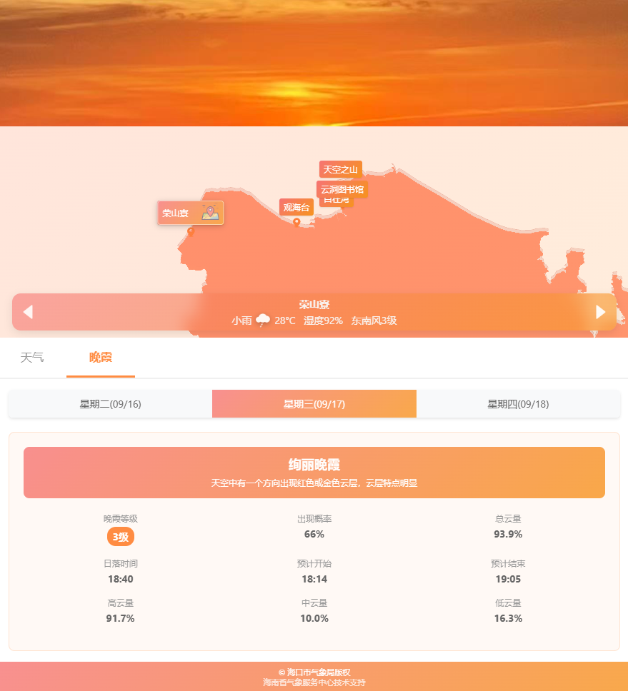 有了心仪打卡地,却纠结该几点去追晚霞?去早了怕等太久,去晚了又怕错过最美瞬间?海口重磅推出的“披着霞光而来”晚霞预报产品,帮你精准捕捉每一天的落日浪漫!
