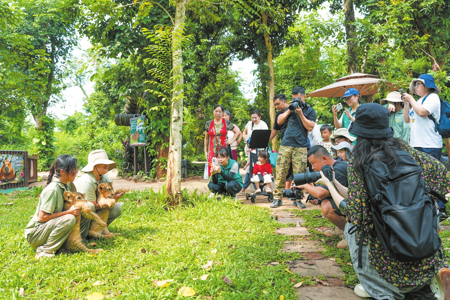 9月21日,在海南热带野生动植物园内,两只刚满2月龄的小狮子兄妹“早早”与“猫猫”同游客见面。