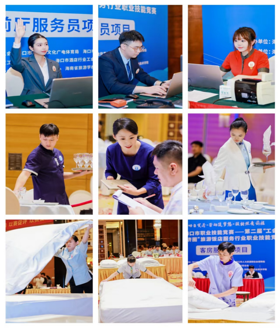 本次大赛由海口市总工会、海口市旅游和文化广电体育局、海口市人力资源和社会保障局联合主办,海口市财贸工会、海口酒店协会、海口市酒店行业工会联合会共同承办。竞赛涵盖前厅服务、客房服务、中餐服务、西餐服务四大传统核心项目,全面覆盖旅游饭店服务全流程。本次参与选手既有深耕行业二十年的技术能手,也有崭露头角的职业新秀,充分展现海口经济圈文旅从业者的梯队活力。