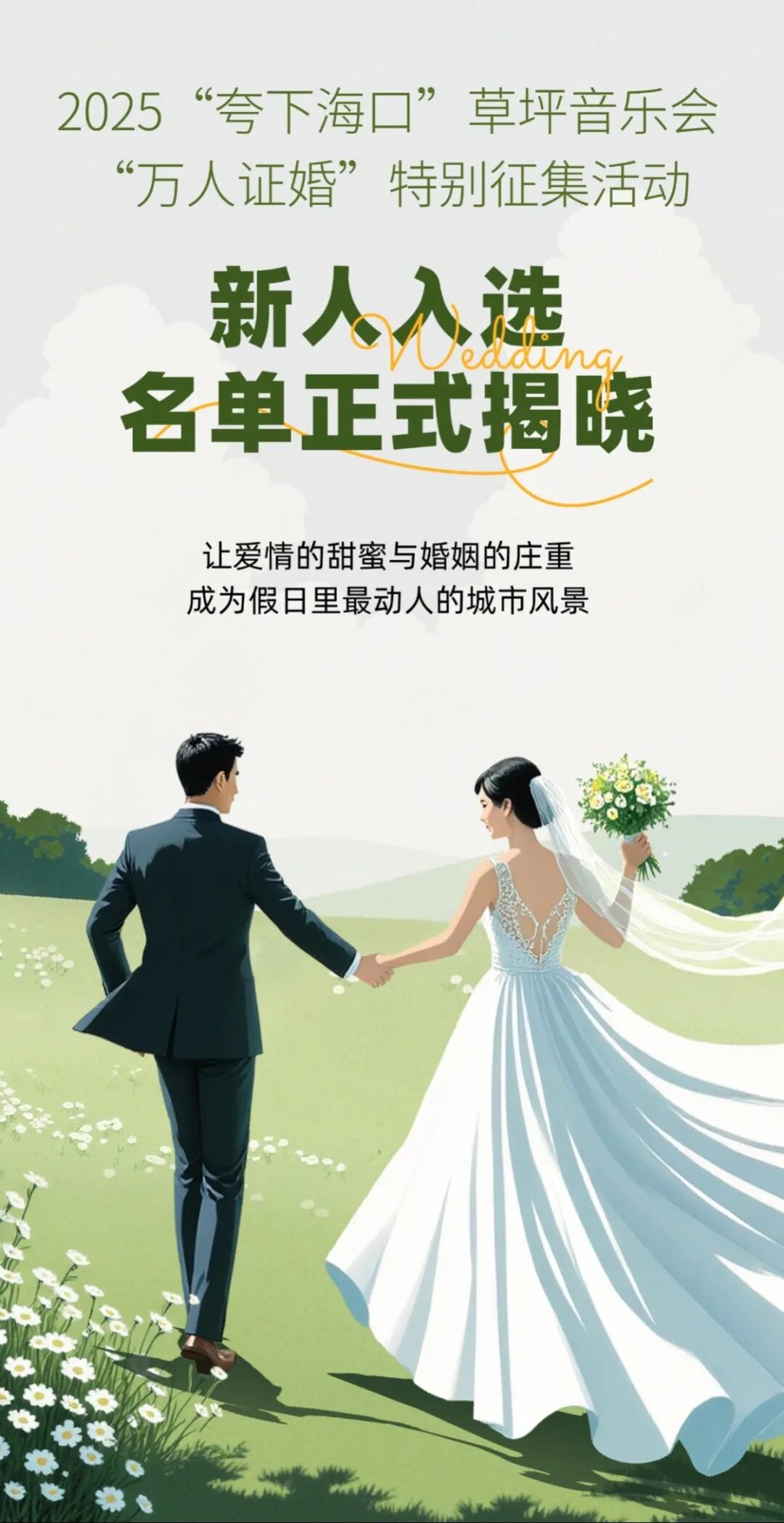 国庆将至,浪漫升温,2025海口艺术周多元艺术气息正席卷全城。今日,海口艺术周重要配套活动——2025“夸下海口”草坪音乐会“万人证婚”特别征集活动,正式发布入选新人名单!
