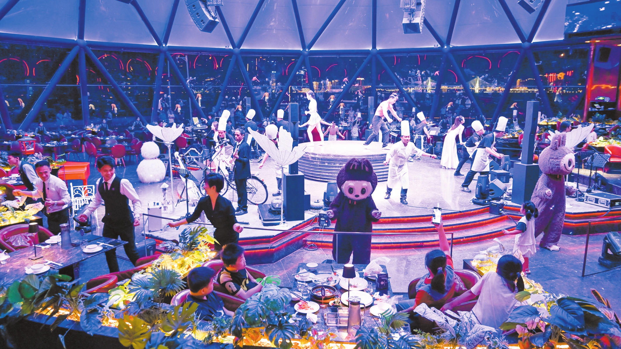 10月7日,华灯初上,海口的夜生活渐渐拉开序幕。在位于海口湾外滩的星空之境&滨海文化演绎中心,精彩节目在聚光灯下接续上演,食客们在享用精致美食的同时,透过落地窗可将璀璨壮观的世纪大桥尽收眼底。