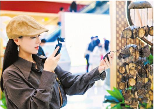 在展览现场看到,平常的椰子壳被艺术家注入春夏秋冬、琴棋书画等元素进行雕刻创作,成了储蓄罐、蓝牙音箱等精美的实用物件。其中,一件高1.33米、宽1.1米的椰雕艺术作品成为现场的焦点,该作品由吴名驹从1400余个椰壳中切割筛选出约2.36万片椰壳片,以传统技艺手工雕琢而成,呈现了骑楼建筑、椰子树、海浪等海南特色元素,吸引不少消费者驻足欣赏。