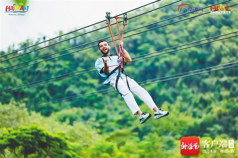 来自巴基斯坦的推荐官韩安冕在体验雨林滑索。海南省旅游和文化广电体育厅供图