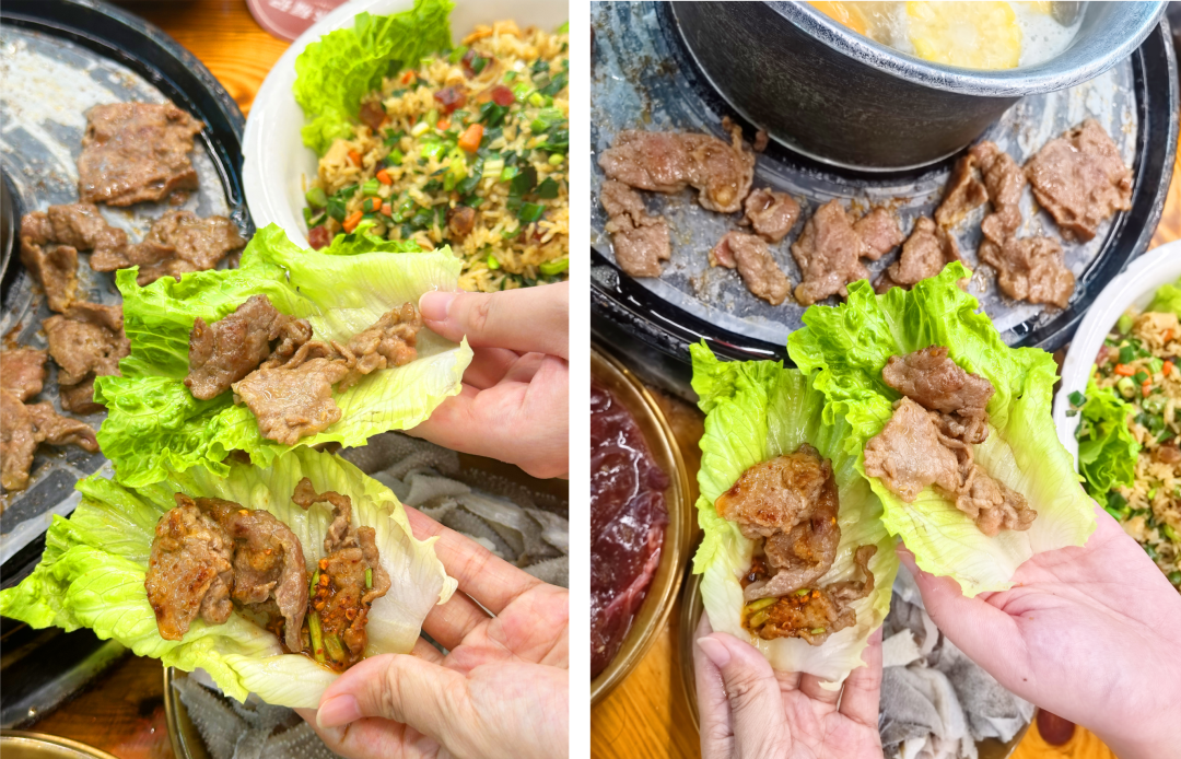 煎上肥瘦相间的牛肉、牛舌或牛肝