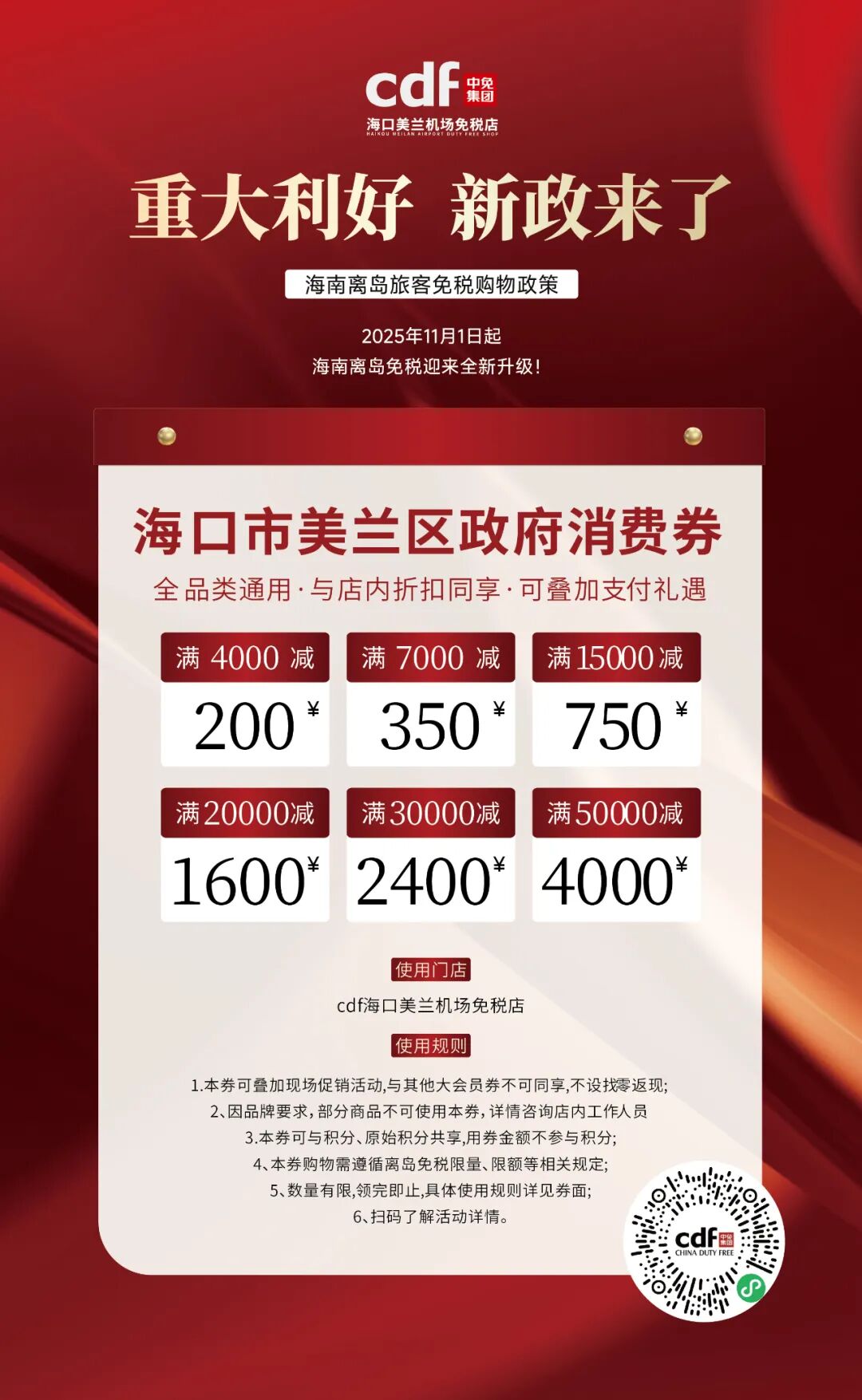 为提振消费信心,促进免税消费,美兰区当前正发放政府免税消费券,有效期至11月30日,最高优惠4000元,适用于 cdf海口美兰机场免税店。
