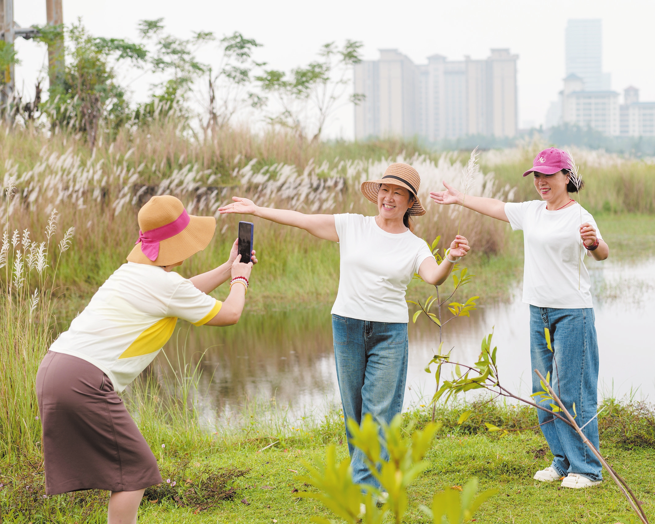 11月1日,海口五源河国家湿地公园内,成片的甜根子草在微风中摇曳,游客沉浸在美景中拍照打卡,感受大自然的野趣生机。