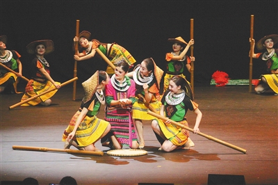 原创黎族舞蹈诗《黎族家园》选段《舂米谣》。