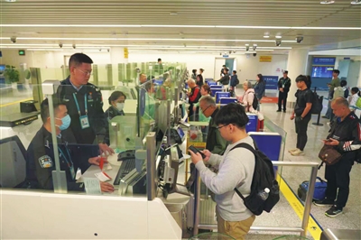 美兰边检站执勤民警为入境旅客办理边检手续。边检供图