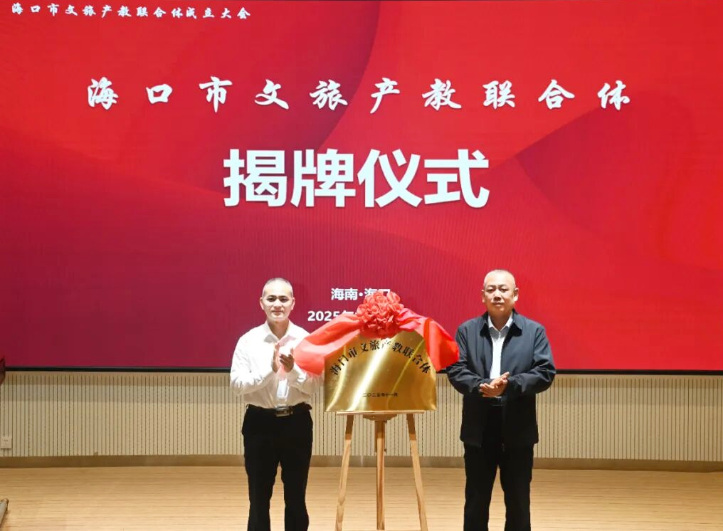 海口市教育局党组成员林元山与海口市旅游和文化广电体育局王军调研员共同为“海口市文旅产教联合体”揭牌