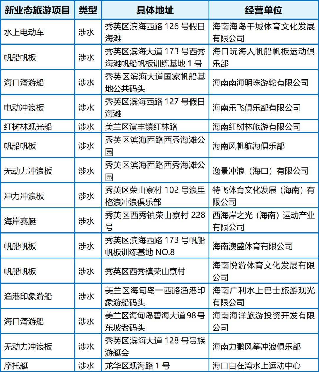 为全面推动海口市水上旅游项目健康有序发展,规范水上旅游项目经营秩序,保障海口市水上旅游安全稳定,对全市经营摩托艇、帆船、桨板(冲浪、水上电动车)等水上旅游项目的企业进行梳理,以下是相关企业、水上项目名称及相关信息清单。
