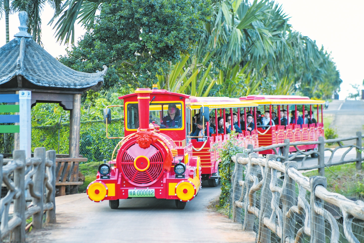 在全球花果之旅生态旅游景区,游客乘坐小火车欣赏美景。本报记者 苏弼坤 摄