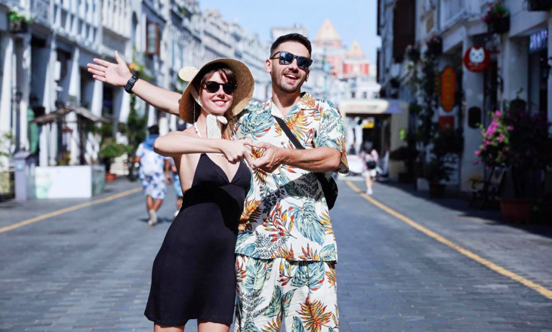 外国游客在海口骑楼老街打卡。海南省旅游和文化广电体育厅供图