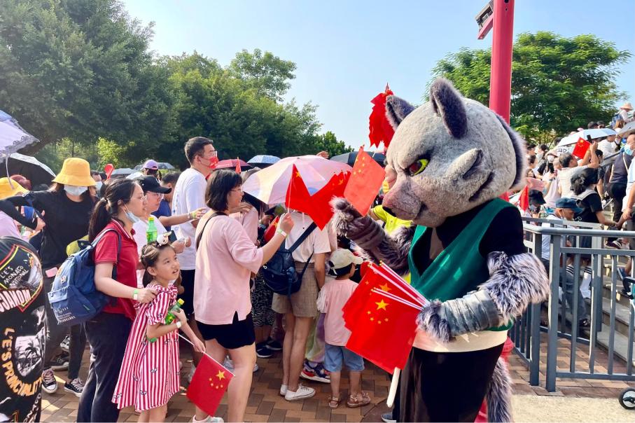 走进长影环球100奇幻乐园,放眼望去如同一片红色的海洋,一面面五星红旗迎风飞舞,一盏盏大红灯笼高高挂起,乐园内的可爱玩偶统统系上了鲜艳的红领巾,营造浓浓国庆氛围。全体工作人员佩戴爱国主题口罩,特殊时期,安全游玩的同时也用特殊的方式表达对祖国的爱。