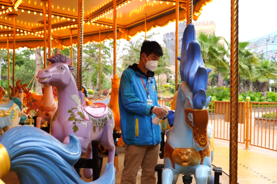 园区内的游乐设施每天至少消毒两次以上,售票窗口、检票口服务人员、保洁员、设备操作员等近距离服务游客的一线员工均佩戴口罩,注重个人卫生和有效防护措施。做好工作人员自身健康保障工作,确保游客的出行安全。