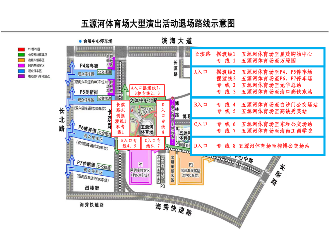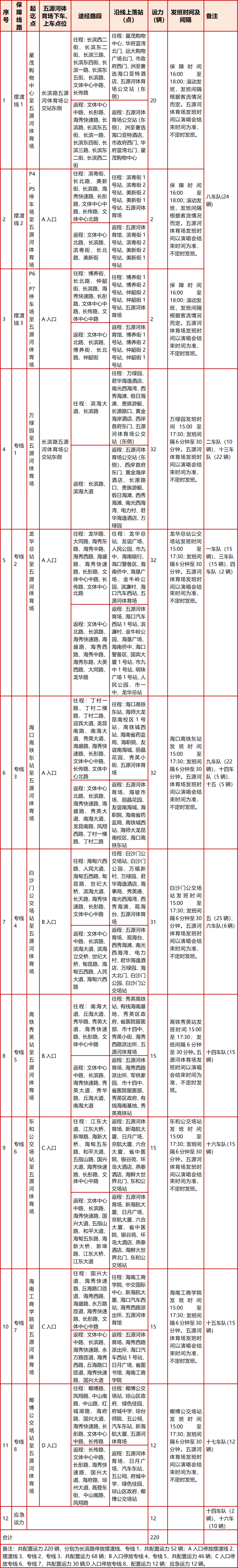 为方便观众出行,海口公交临时开通11条演唱会免费专线,提供方便、快捷、舒适的出行服务。特别提醒:演出结束后,大量观众集中离场,出租车、网约车候车排队时间过长,难以保障快速疏散,建议观演市民、游客优先选择搭乘公交车到达市区,再选择其他出行方式至目的地。请提前规划好返程路线并熟悉返程公交乘车点位置。
