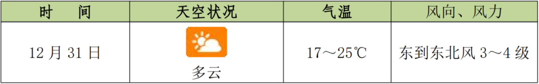 预计,12 月 29 日~31 日,我市受冷空气影响,以多云天气为主, 最低气温 13~17℃,最高气温 24~27℃。