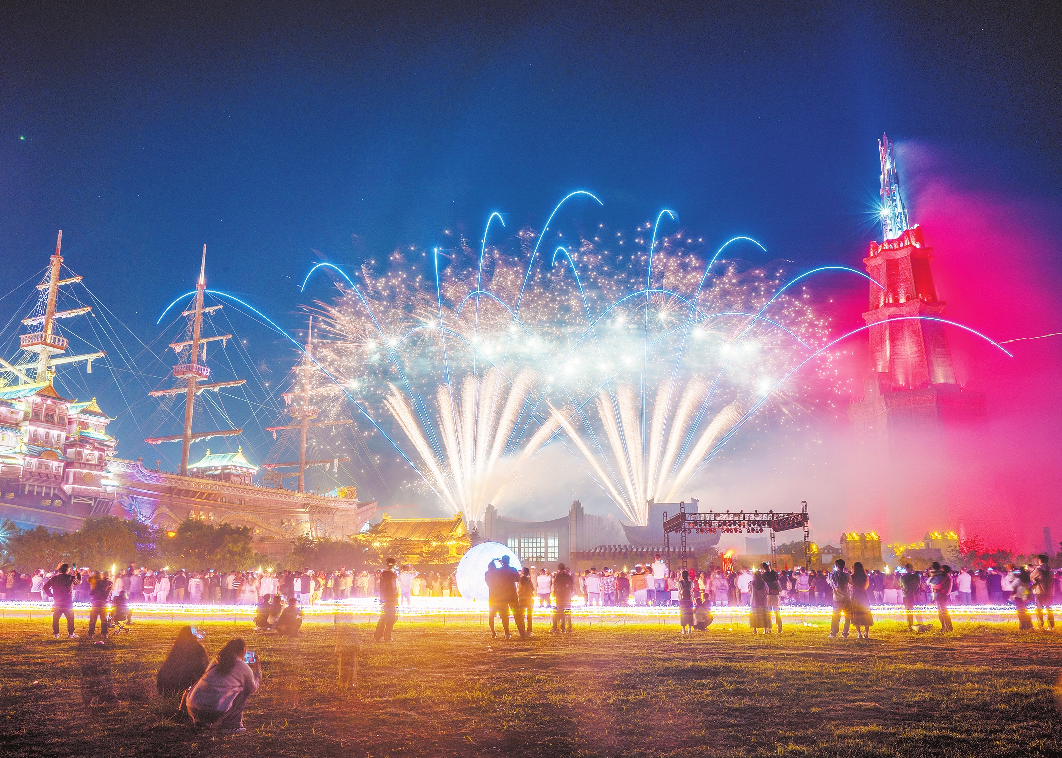 元旦假期,海口丰富多彩的文旅活动,吸引众多市民游客热情参与。图为市民游客在海南长影奇幻乐园欣赏烟花秀。本报记者 石中华 摄