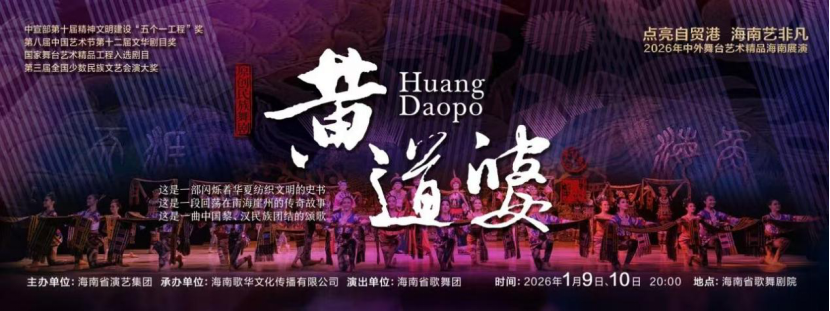 扎根本土文化土壤,琼山让本土文艺之花绚烂绽放。1月9日至10日,海南省歌舞团创排的民族舞剧《黄道婆》率先在海南省歌舞剧院与观众见面,拉开系列演出的序幕。该剧讲述宋末元初棉纺织家黄道婆流落崖州,向黎族群众学习并革新纺织技术、最终“衣被天下”的传奇故事,剧中巧妙融入黎族“纺、染、织、绣”四大技艺,舞美融合海南热带风光与黎锦图案,音乐实现黎族乐器与交响乐的跨界碰撞,全方位展现海南本土文化魅力。更值得期待的是,该剧享受政府惠民票补贴,以亲民票价邀请市民走进剧院,切实感受本土非遗与舞台艺术的融合之美。