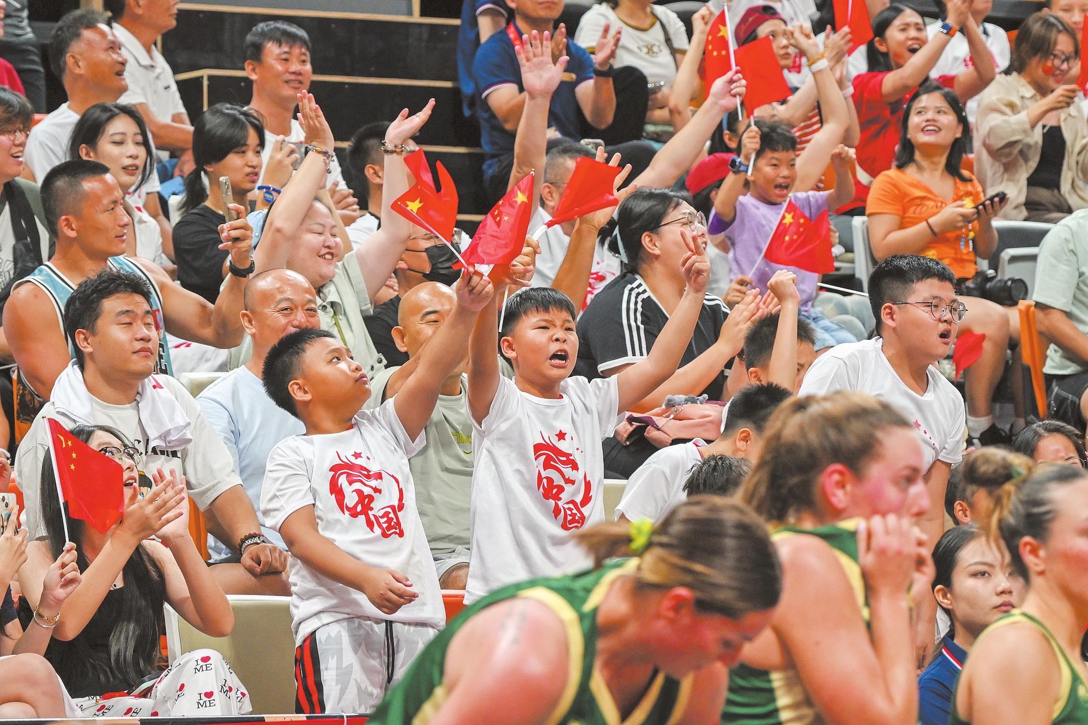 在海口五源河体育馆,中国女篮迎战澳大利亚女篮比赛中,观众为球员助威呐喊。