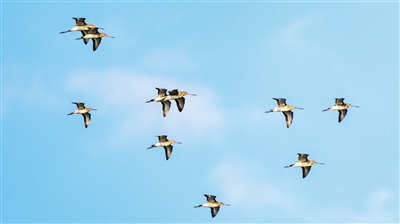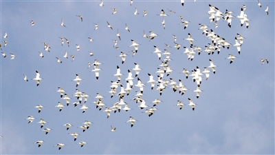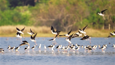 湿地浅滩上,黑翅长脚鹬迈着标志性的红色细腿,低头在水中扫动长嘴觅食,一举一动尽显“红腿娘子”的曼妙。忽而一阵振翅声划破静谧,黑尾塍鹬率先盘旋升空,紧接着一群“翘嘴精灵”闯入视野,正是国家“三有”保护动物反嘴鹬。它们身着黑白相间的“斑马纹华服”,淡蓝灰色的大长腿修长挺拔,独特的上翘长嘴是辨识度拉满的“专属标志”,在水面或扫或啄,将小鱼、贝类等美食收入囊中,姿态优雅又灵动。
