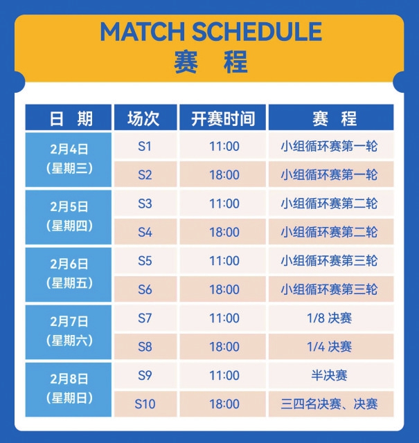 3轮小组赛将于2月4日至2月6日举行;2月7日的日场将举行十六强赛,夜场举行八强赛;2月8日日场举行半决赛,夜场举行季军赛和决赛。
