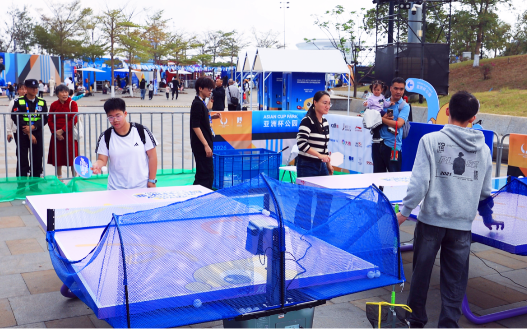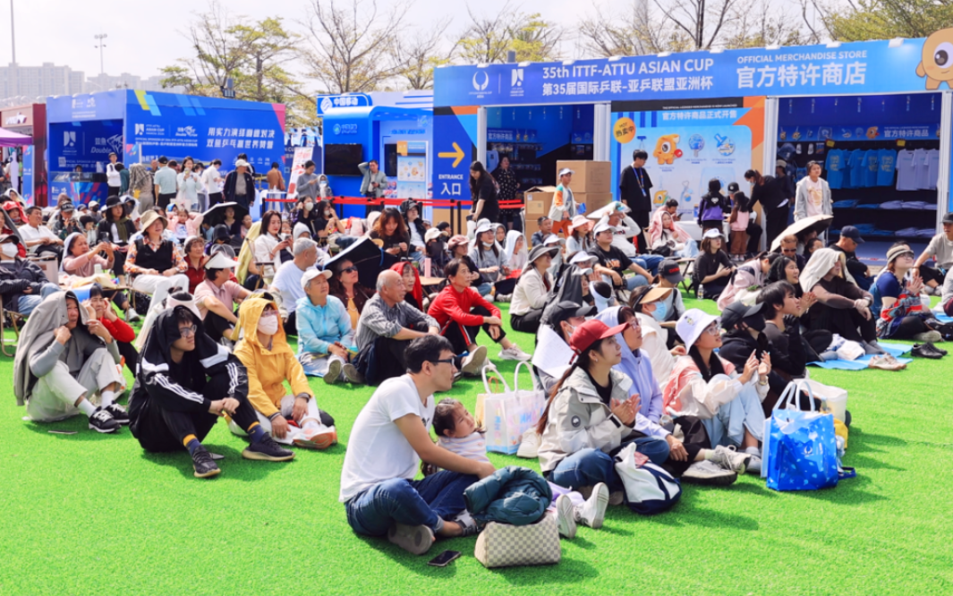 入口处的巨型乒乓球艺术装置与萌趣的吉祥物“亚洲宝宝”气模吸引众多观众合影留念。许多家庭观众和孩子在“敢乒你就来”智能发球机前排起长队,体验着乒乓的独特乐趣;“乒乓过河”等趣味游戏区则传来阵阵欢声笑语;手持集章地图的球迷穿梭于各品牌互动区完成集章任务,兑换限定礼品。官方特许商品区人气高涨,吉祥物衍生品备受青睐。