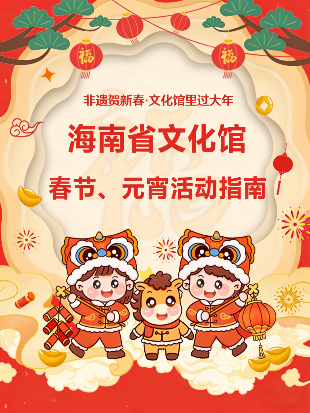 春节,是镌刻在每个中国人心中最温暖的文化图腾,是流淌于血脉里的团圆期盼。自2024年12月4日,“春节 —— 中国人庆祝传统新年的社会实践”成功入选联合国教科文组织“人类非物质文化遗产代表作名录”,这一承载着千年华夏文脉的传统佳节,愈发彰显出跨越国界的迷人光彩。为传承和弘扬中华优秀传统文化,丰富群众的节日文化生活,进一步激发文化生命力,海南省文化馆(海南省非遗中心)精心筹备了一席年味浓郁的 “文化大餐”。诚邀广大市民游客共赴这场文化之约,在自贸港的蓬勃生机中,感受春节的独特魅力与无限活力。