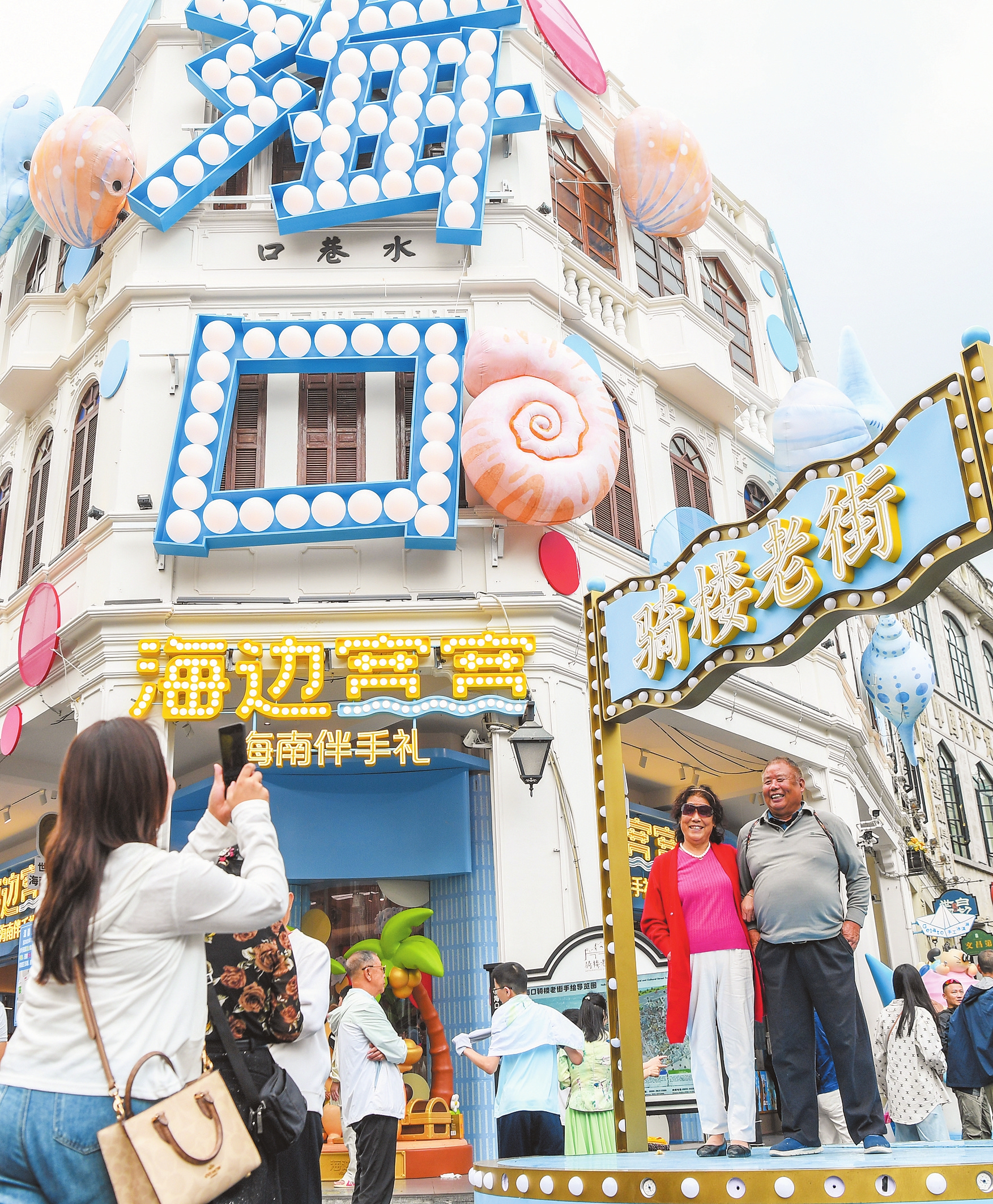 2月10日,市民游客在海口骑楼老街拍照打卡,沉浸式体验海口节庆氛围。