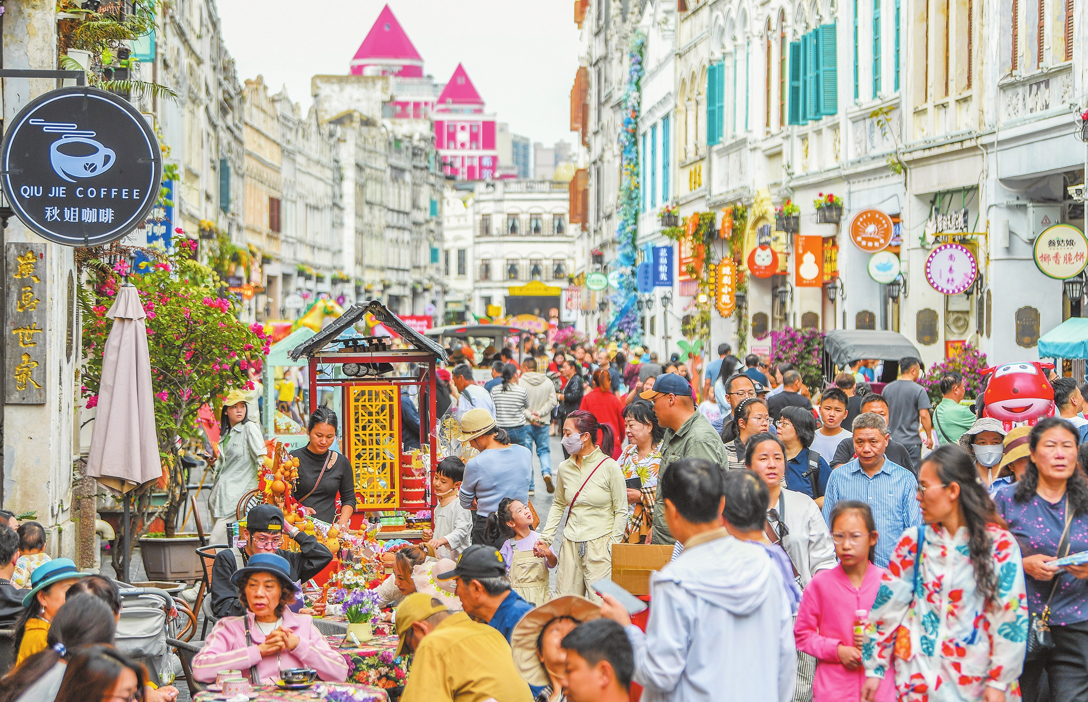 在龙湖海南海口天街,以“华灯祈岁·红妆满园”为主题的庙会启幕,10米高的祈愿灯笼高高挂起,年宵花房里姹紫嫣红,营造出红火的新春氛围。此外,今年以来,该商圈多家首店品牌接连开业,蔡林记海南首店、李若桃海口首店、窗苔海口首店、橘朵海南首店等全新亮相,其中多个餐饮品牌开业即迎来高人气,用餐高峰期等候的顾客排起小长队,消费态势十分火爆。