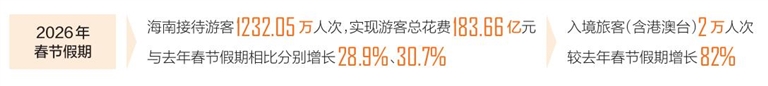 2月24日,海南省旅游和文化广电体育厅发布数据,2026年春节假期海南接待游客1232.05万人次,实现游客总花费183.66亿元,与去年春节假期相比,分别增长28.9%、30.7%。以9天“加长版”黄金周叠加自贸港政策红利与热带海岛资源引力,全省旅游市场呈现人气旺、消费热、年味浓、国际化等特点。