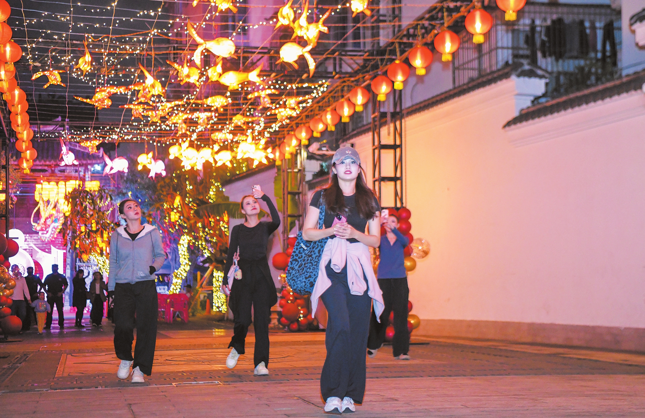 再向前走,福地夜巷内人声鼎沸,把新春的热闹推向高潮。沿福地夜巷向周边探寻,可以行至秀衣坊、宗伯里等古巷道,精致花灯与古建筑交相辉映,一步一景、一步一韵。漫步其间,仿佛能穿越千年时光,触摸到古城最醇厚的春节气息。