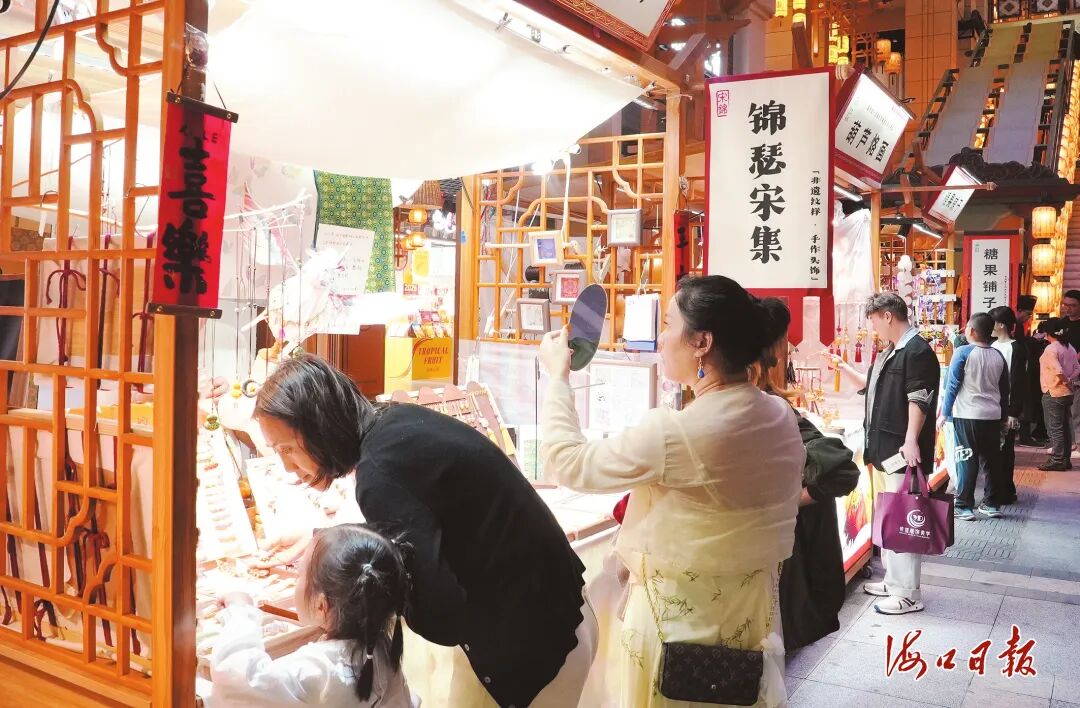 2月25日晚,美兰区东坡老码头灯火通明。古色古香的街道上,工作人员身着传统服饰招徕顾客,流光溢彩的灯光与“古建筑”交相辉映,让人恍若置身宋朝街市。