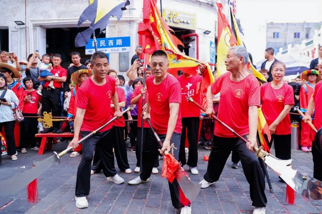 “行符”是海口地区春节期间特有的民俗活动,每年正月初七至正月三十,各街镇、村落都会轮流举行巡游祈福。今年正月十二,骑楼老街作为龙华区核心区域率先启动,拉开了海口“行符月”的大幕。巡游队伍中,来自山西运城关公故里的关公大刀方阵格外引人注目。12名队员手持仿古关公刀,动作刚猛整齐,原汁原味地展现了关公故里的传统武韵。这不仅让本地的市民感受到了不同地域文化的魅力,也让远道而来的游客们大开眼界。