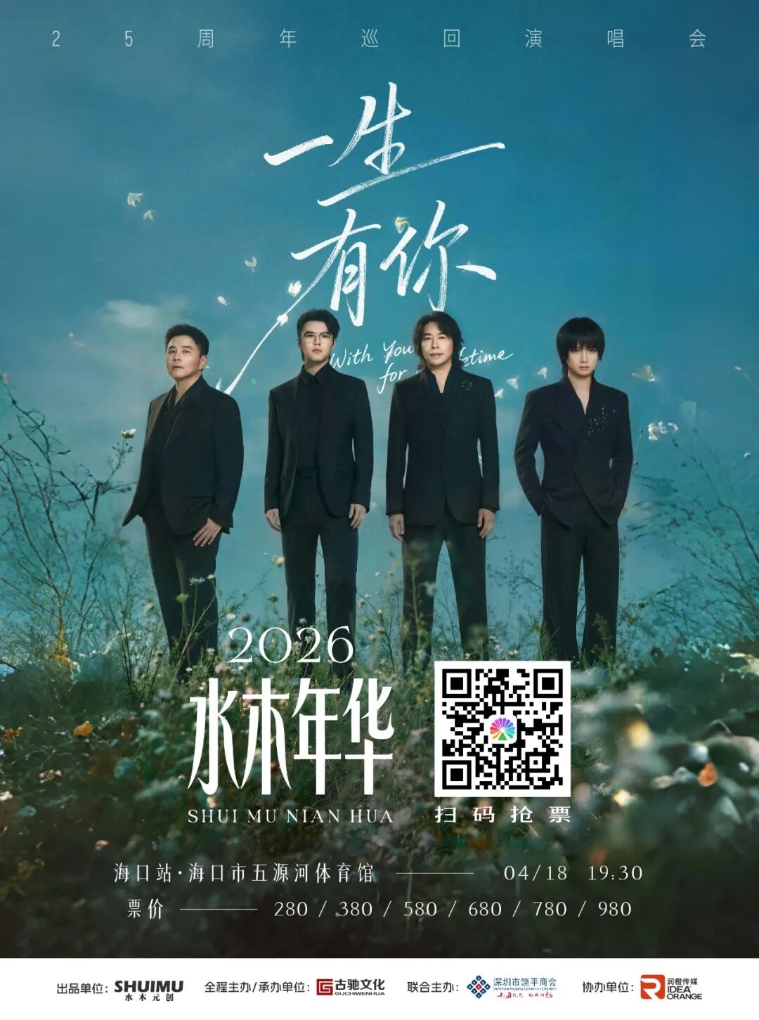 4月18日19:30,水木年华「一生有你」2026二十五周年全新巡演全国首站——海口站,将在海口市五源河体育馆亮相。