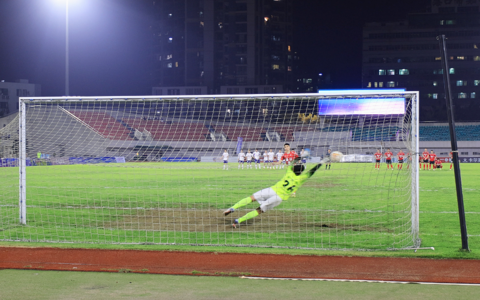 首轮,双方球员均稳稳命中,1:1;第二轮,依旧弹无虚发,2:2;第三轮,海口队门将杨宁发挥神勇,将昌江队主罚的点球拒之门外,海口队第三名出场的球员顶住压力,成功将球送入网窝,3:2,海口队取得优势;第四轮,双方均稳稳罚进,4:3。