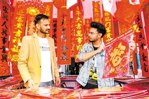 2月4日农历小年,在海南医学院就读的大三留学生夏金兵和海岩来到新城吾悦广场的年货市集。红红火火的对联、品种多样的点心、花团锦簇的盆栽……两位外国小伙在琳琅满目的年货海洋中看花了眼,体验海口的浓浓年味。
