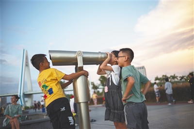 日前,椰城海口天气晴好,市民游客纷纷走到户外,呼吸清新口气,吹吹凉爽的海风,欣赏海上夕阳。图为孩子们在海口湾通过望远镜看海口美景。 本报记者 宋国强 摄