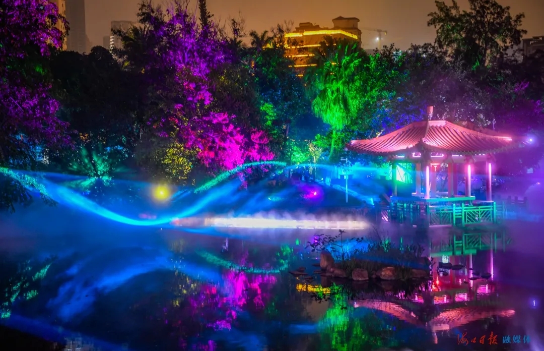 海口五公祠景区灯光交织变换、水雾缭绕,如同仙境。海口日报记者 康登淋 摄