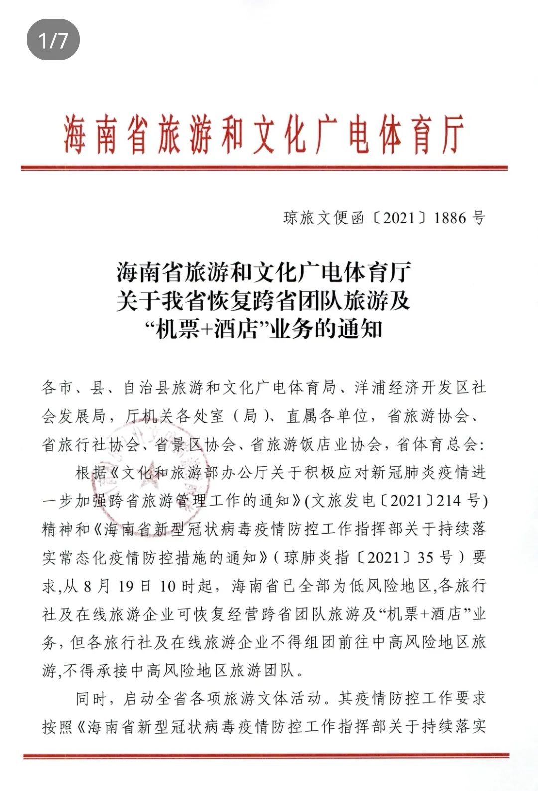 从8月19日10时起,海南省已全部为低风险地区,海南省旅游和文化广电体育厅发布最新通知,各旅行社及在线旅游企业可恢复经营跨省团队旅游及“机票+酒店”业务,但各旅行社及在线旅游企业不得组团前往中高风险地区旅游,不得承接中高风险地区旅游团队。同时,启动全省各项旅游文体活动。