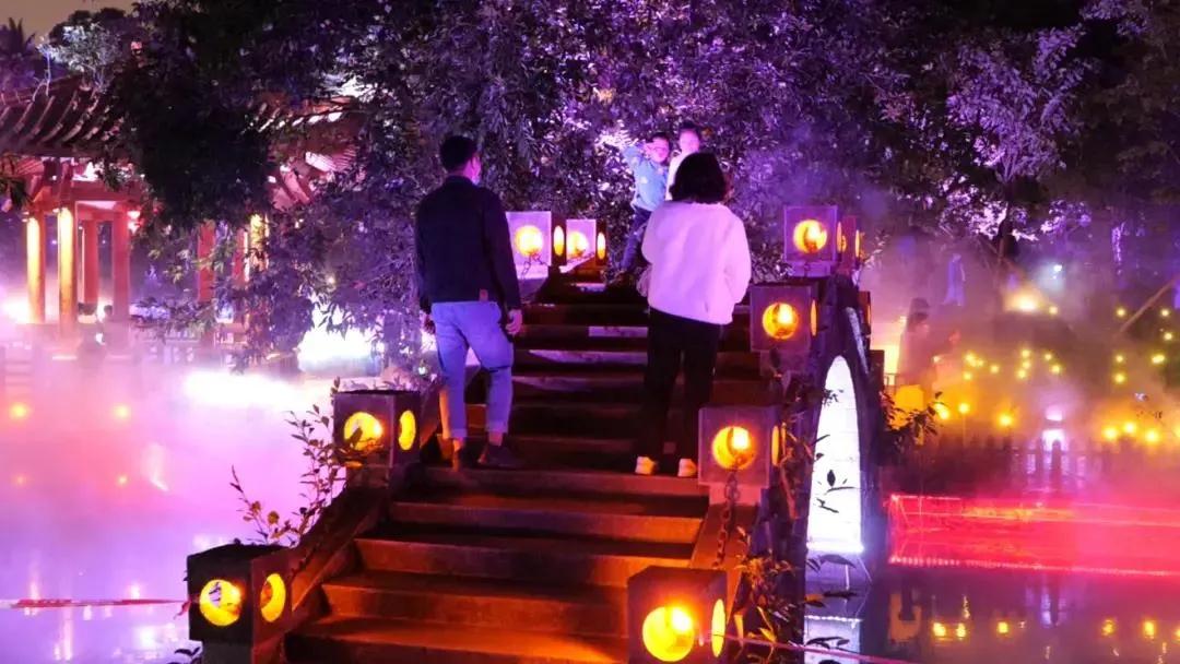 于春节前“盛装亮相”的海口新晋夜游“网红”——五公祠夜景夜游项目,在红墙之内,满园火树银花、梦幻绮丽。 伴随着古色古香的音乐响起,琼台福地的夜空,照亮了五公祠的文物古迹,古老的旧貌换“新颜”,让你在光影中重温历史文化。