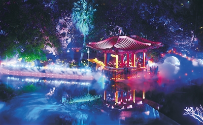 春节期间,海口五公祠在夜色下焕发新活力,艺术灯光秀吸引了不少市民游客前来观赏。本报记者 封烁 摄
